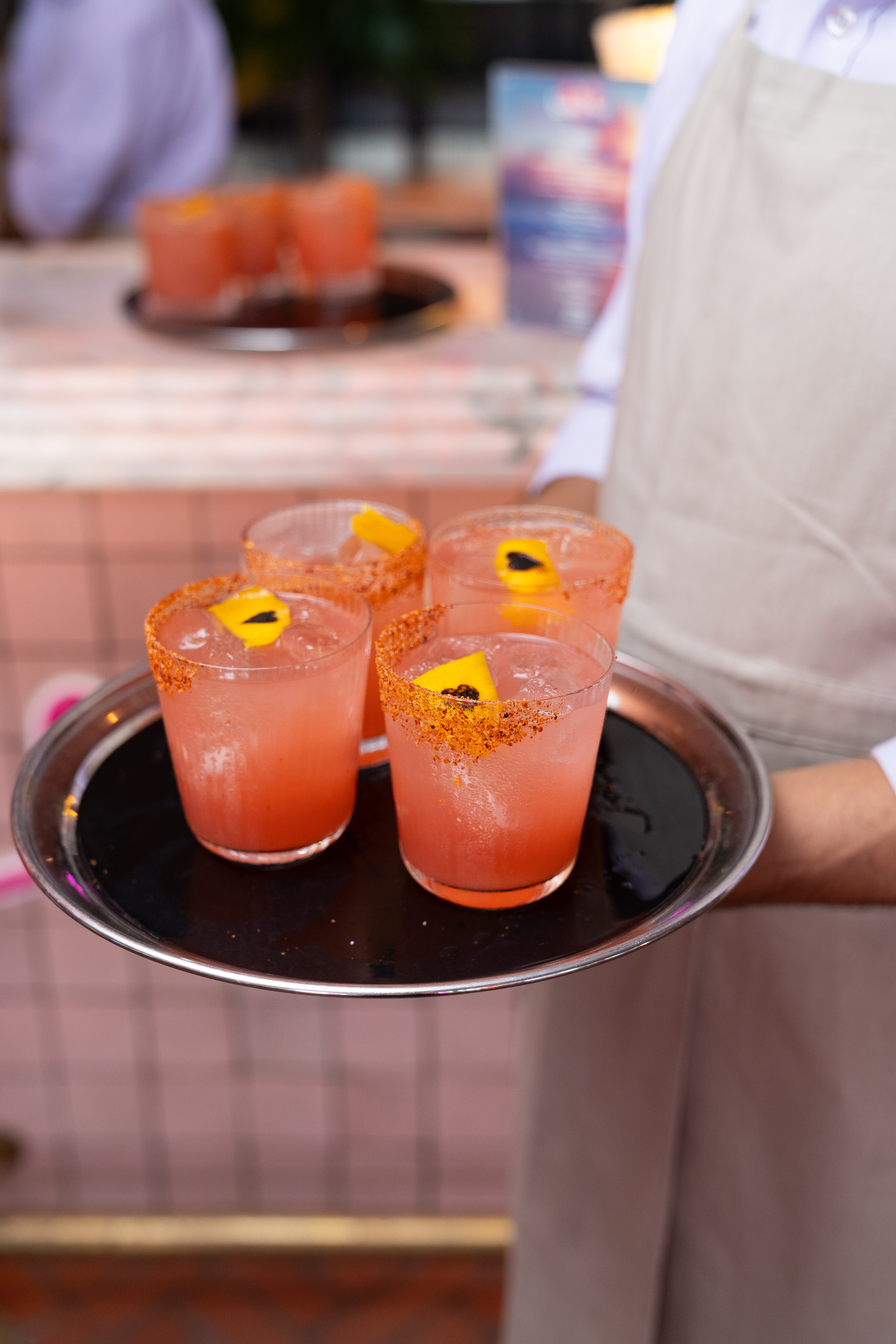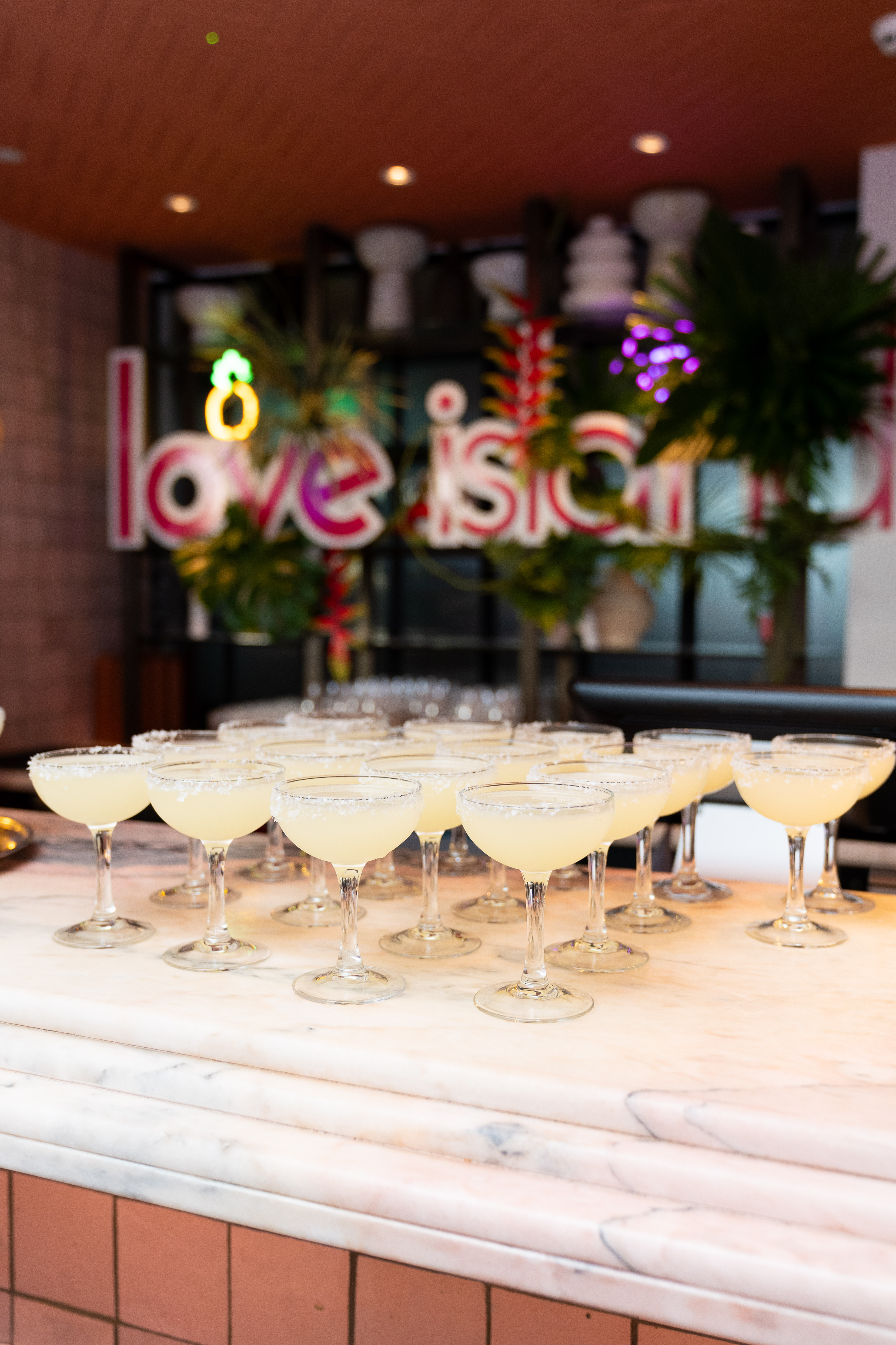 small island bar at One Hundred Shoreditch with a bright pink front with the Love Island logo on in white. Beautiful multi-coloured flowers adorn the bar to celebrate the Summer Party 2025.